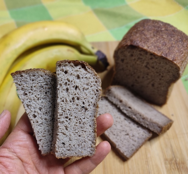 Она попросила меня разработать рецепт, что я с энтузиазмом сразу и сделала. Купила дорогущую муку зелёных бананов и вперёд на свою экспериментальную кухню. Хлеб получился прекрасный с первого раза. Я бы сказала, что из всех безглютеновых хлебов, которые прошли через мои руки, больше всего именно этот похож на ржано- пшеничный хлеб по вкусу. Во время выпечки по кухне распространяется аромат бананов, но в готовом хлебе банановая тема вообще никак не ощущается. Приятная кислинка от закваски, великолепный мякиш, прочная структура. Да, это мог бы быть идеальный безглютеновый хлеб. Если бы не цена на муку. Она зашкаливает. Надеюсь, в связи с устойчивой тенденцией на безглютен цена когда-нибудь приблизиться к адекватной. Забавно, что в Африке банановая мука является дешёвой заменой пшеничной. Вот так. Кто чем богат, тому это не надо сто лет. А нам вот надо)