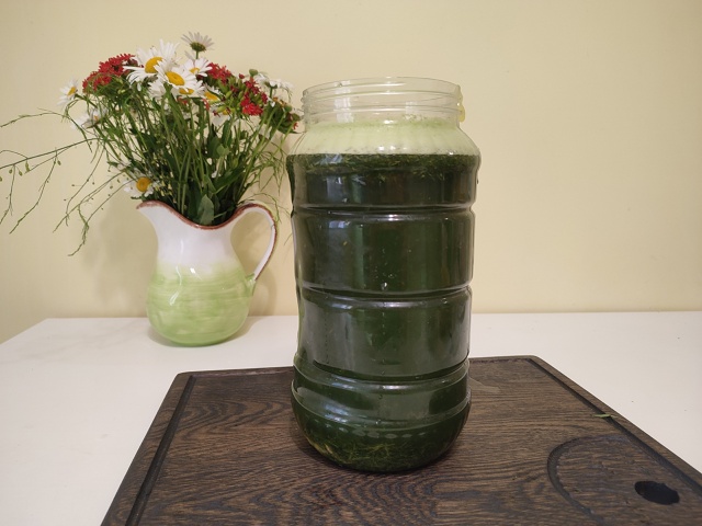 Смешать зелёную массу с остатками воды по рецепту, добавить мёд, опару, нарезанный дольками лимон, перемешать, закрыть крышкой и оставить бродить 24 часа( или больше) . Затем процедить через мелкое сито и разлить в пластиковые бутылки, оставить при комнатной температуре ещё на 12 часов, затем убрать в холодильник ещё на 12 часов. Напиток готов, когда он стал хорошо газированным.